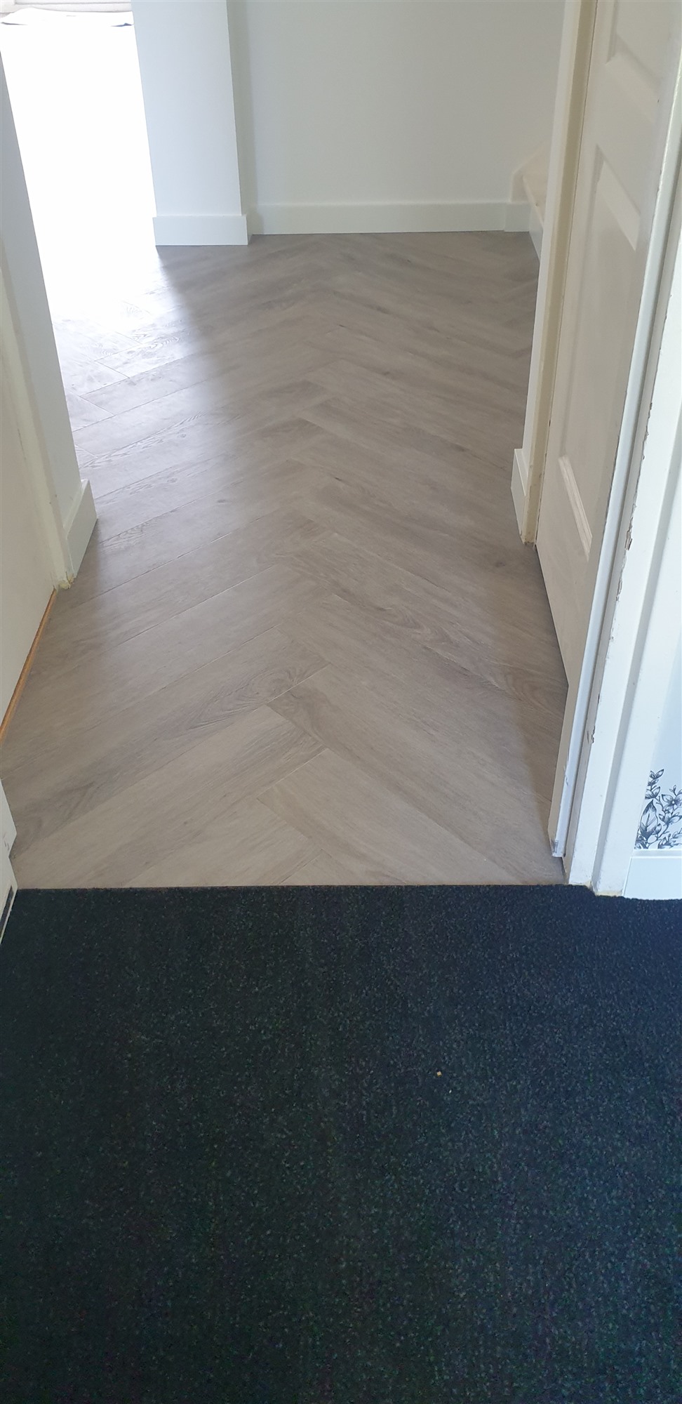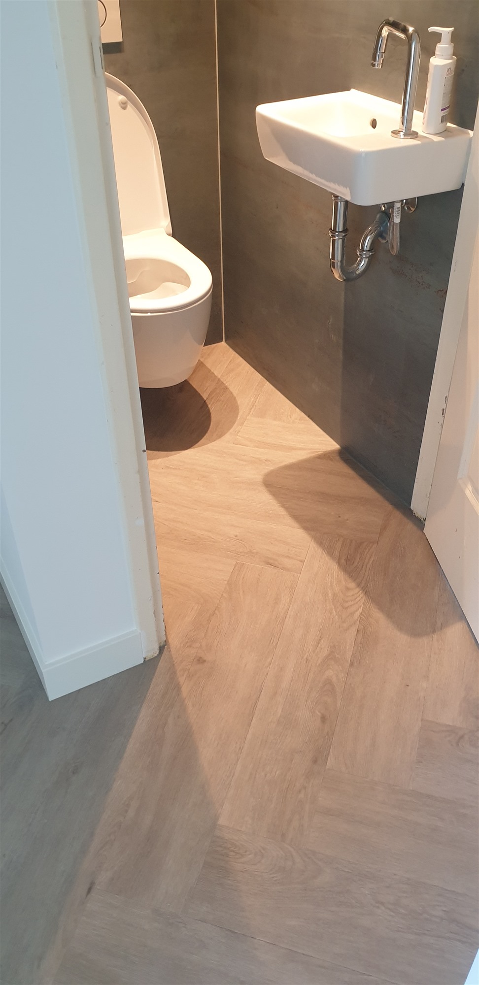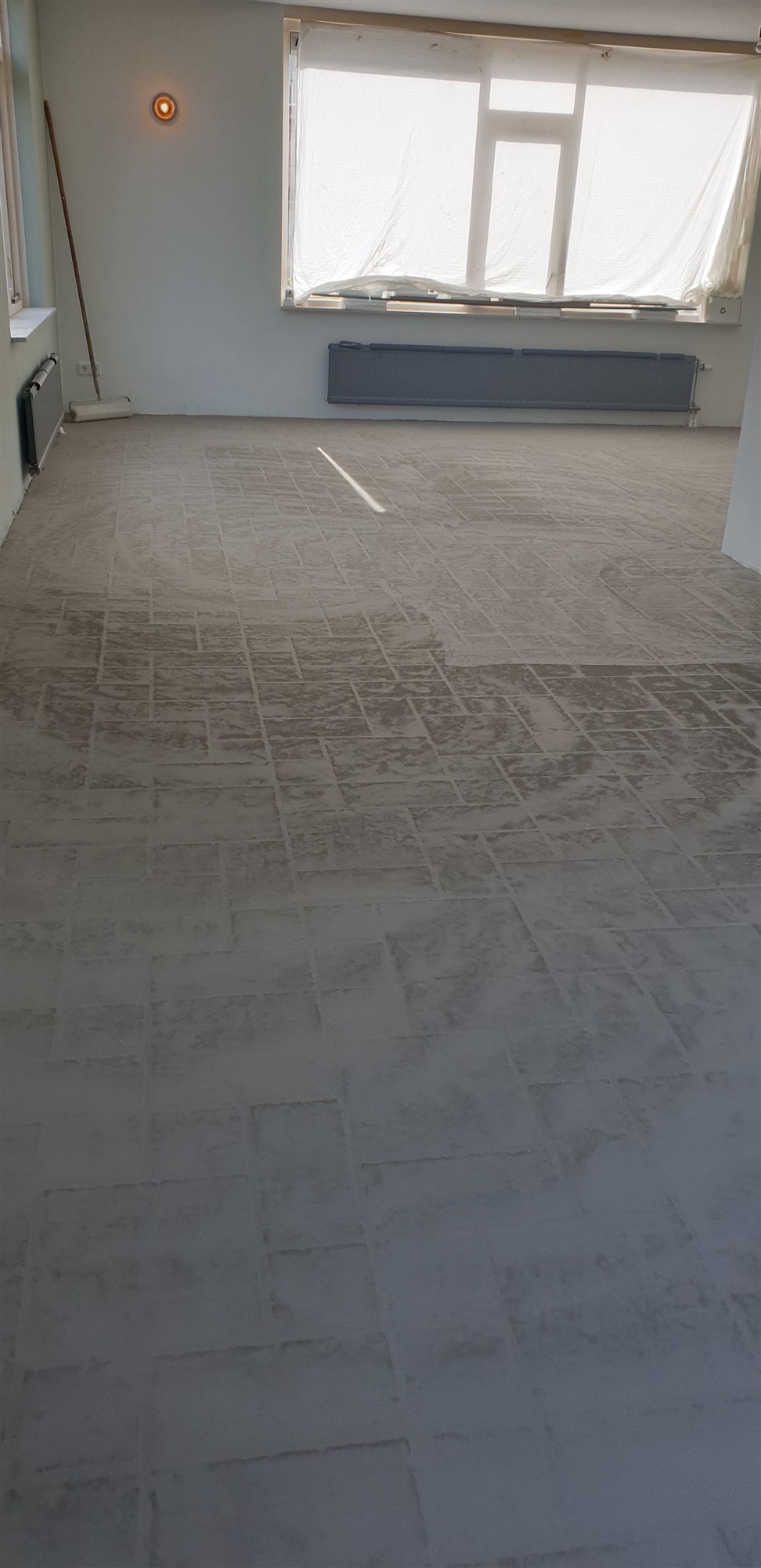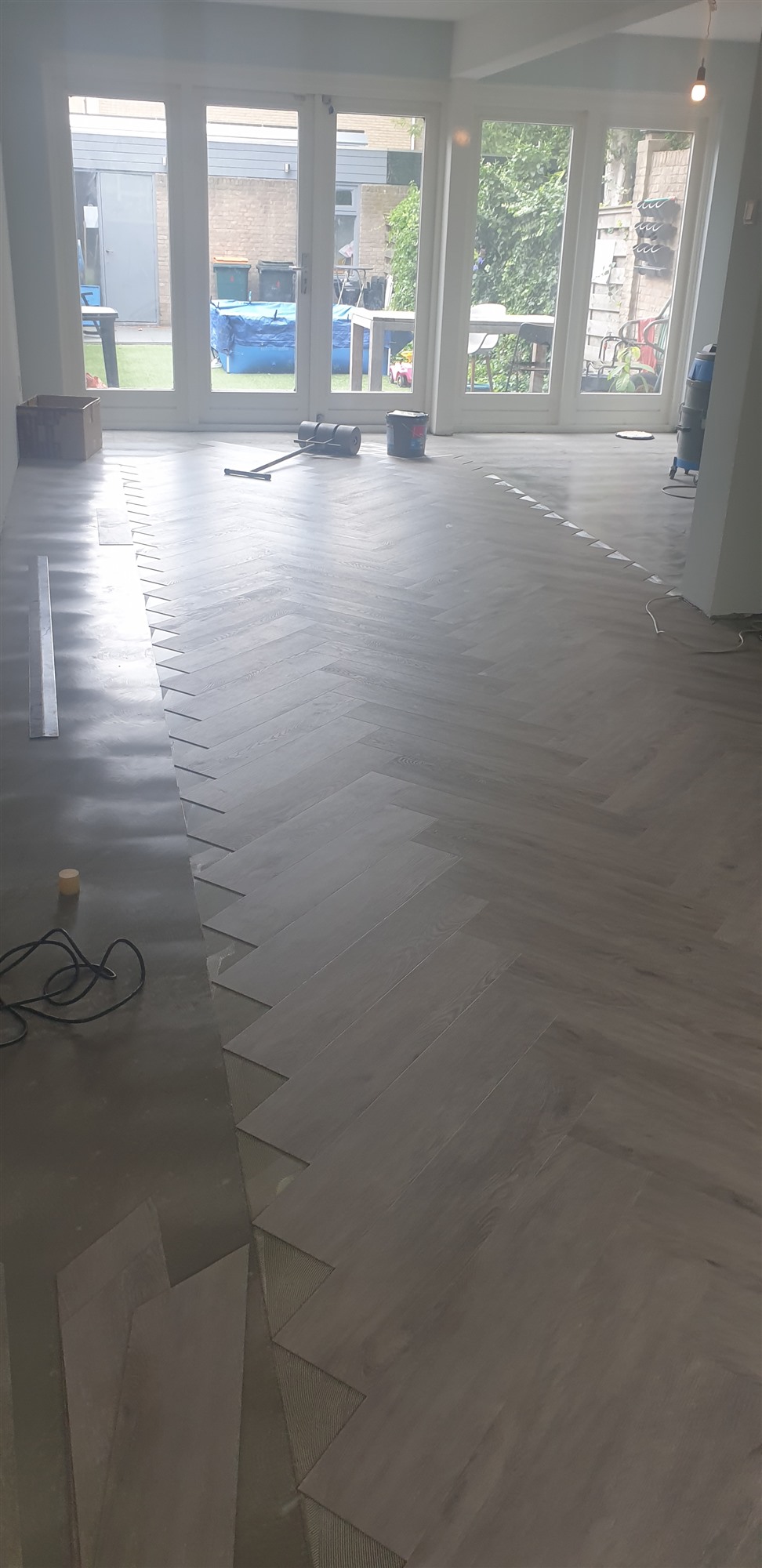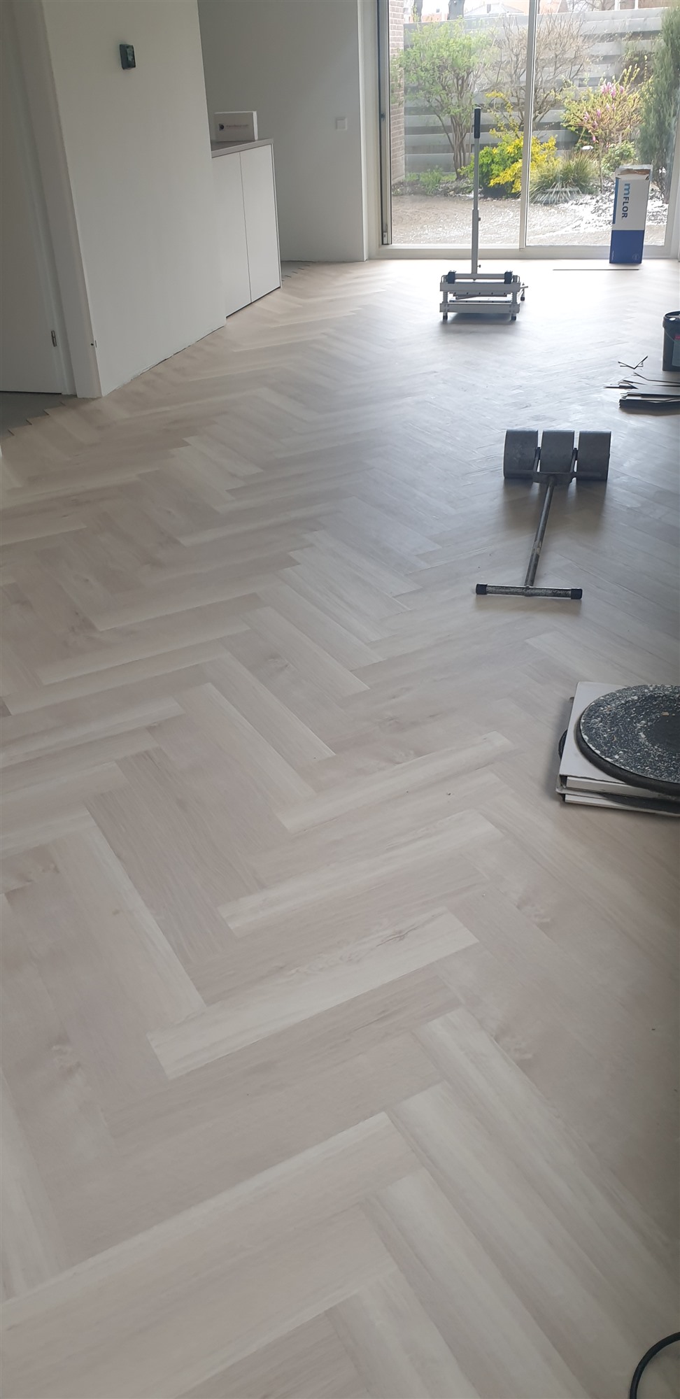 Na eerst een primer / schraplaag aangebracht te hebben de vloer geegaliseerd.Waarna we de visgraad pvc konden verlijmen.