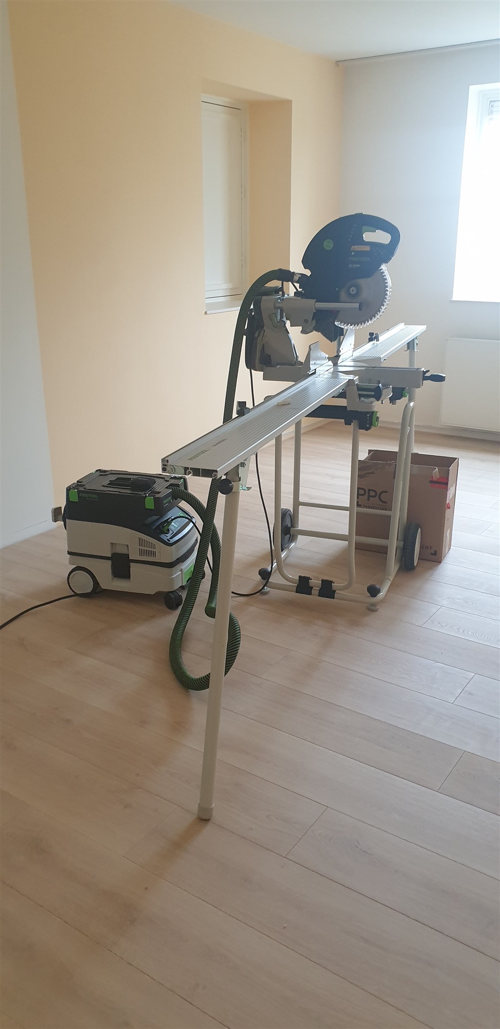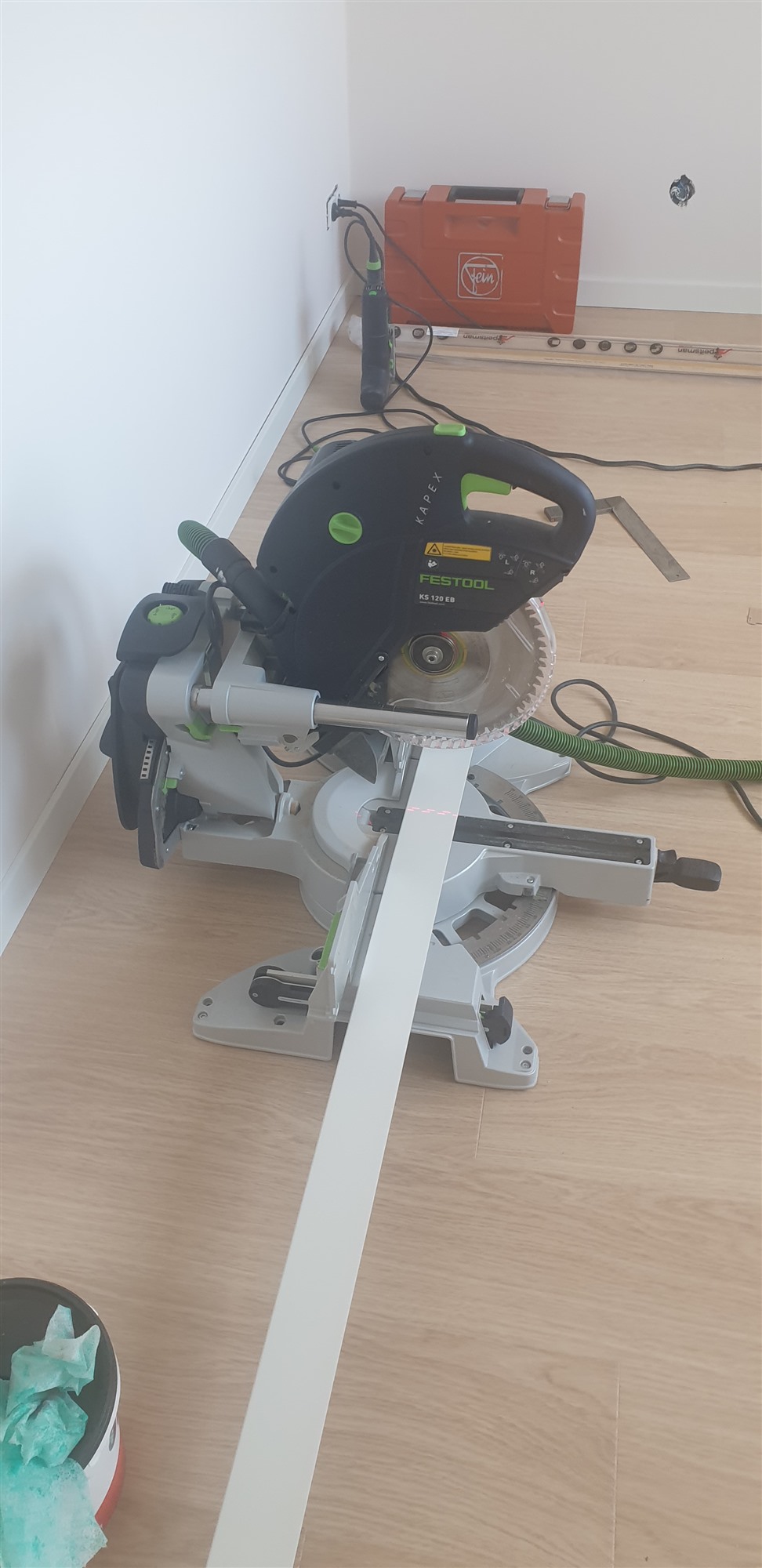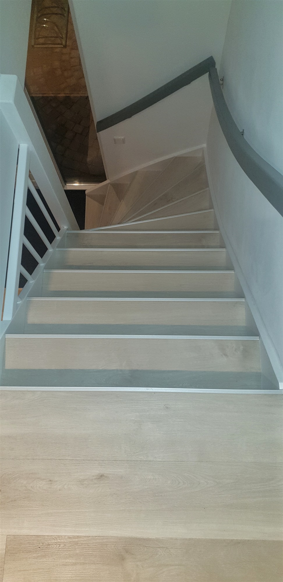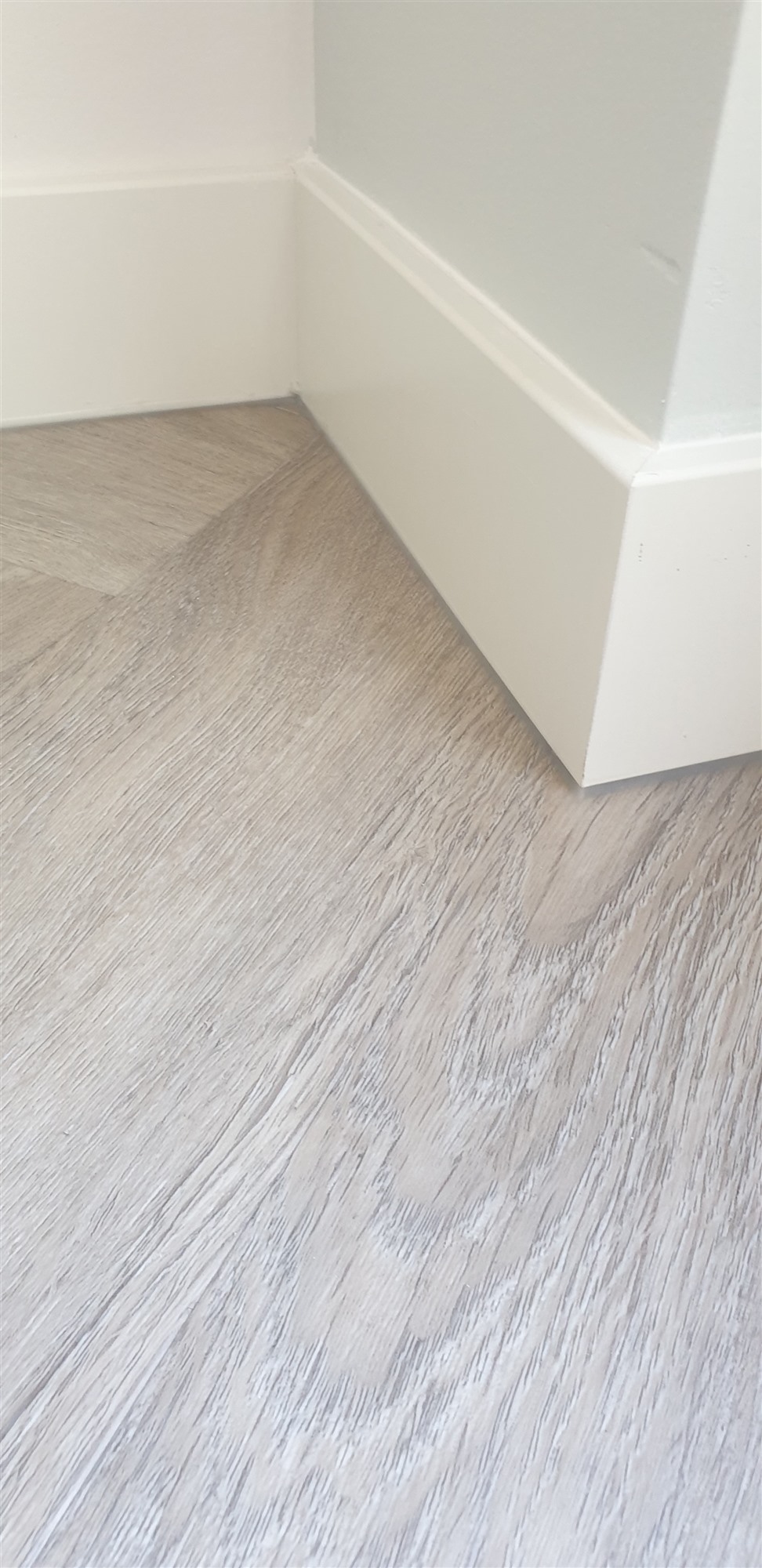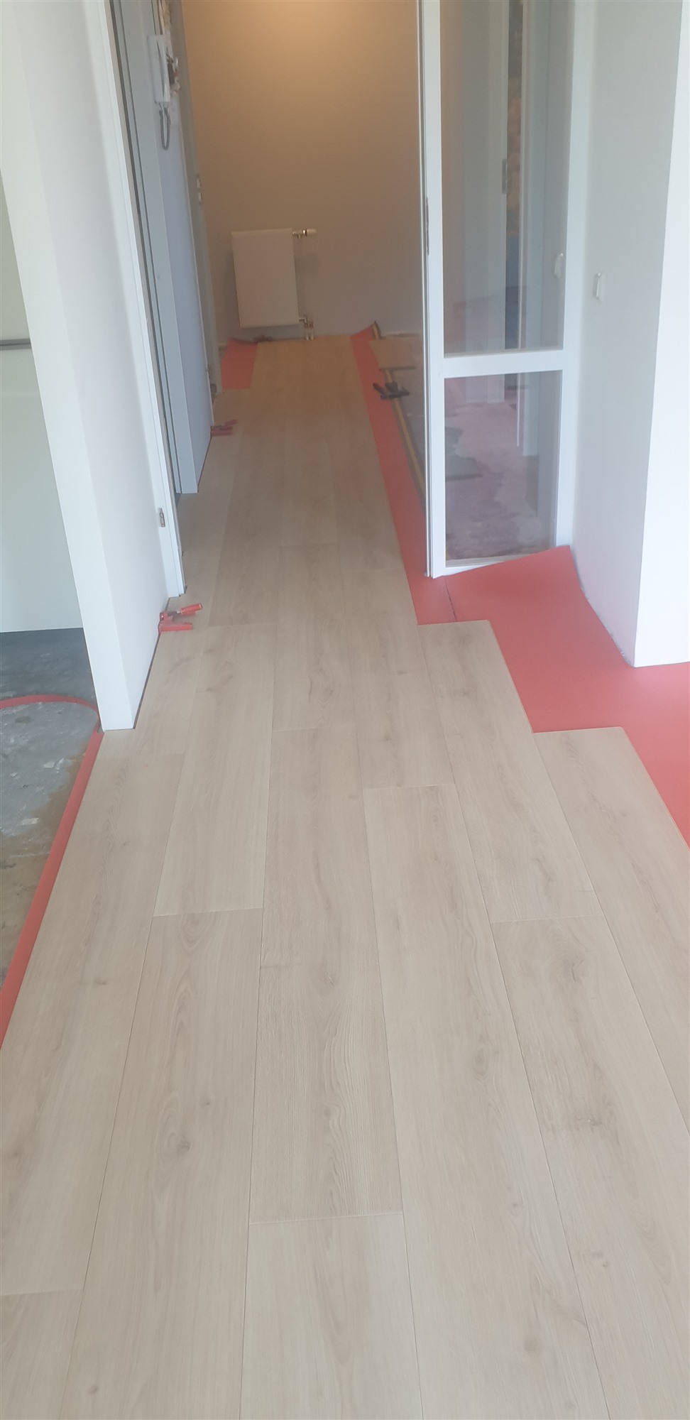 Na eerst een primer / schraplaag aangebracht te hebben de vloer geegaliseerd.Waarna we de visgraad pvc konden verlijmen.