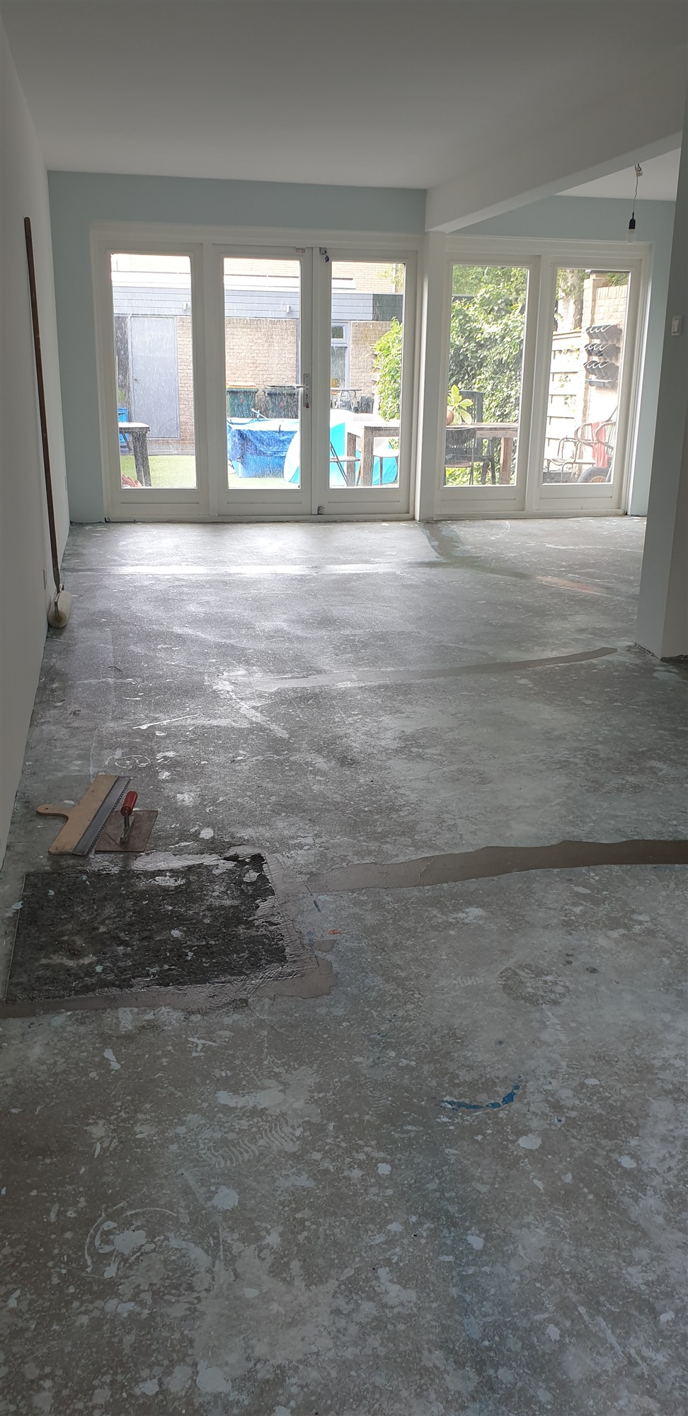 Hier is gekozen om over een bestaande plavuizenvloer met vloerverwarming heen te leggen nadat wij de vloer grondig nagekeken te hebben op losse of holle ruimtes onder de tegels , in dit geval was de vloer in goede conditie.
