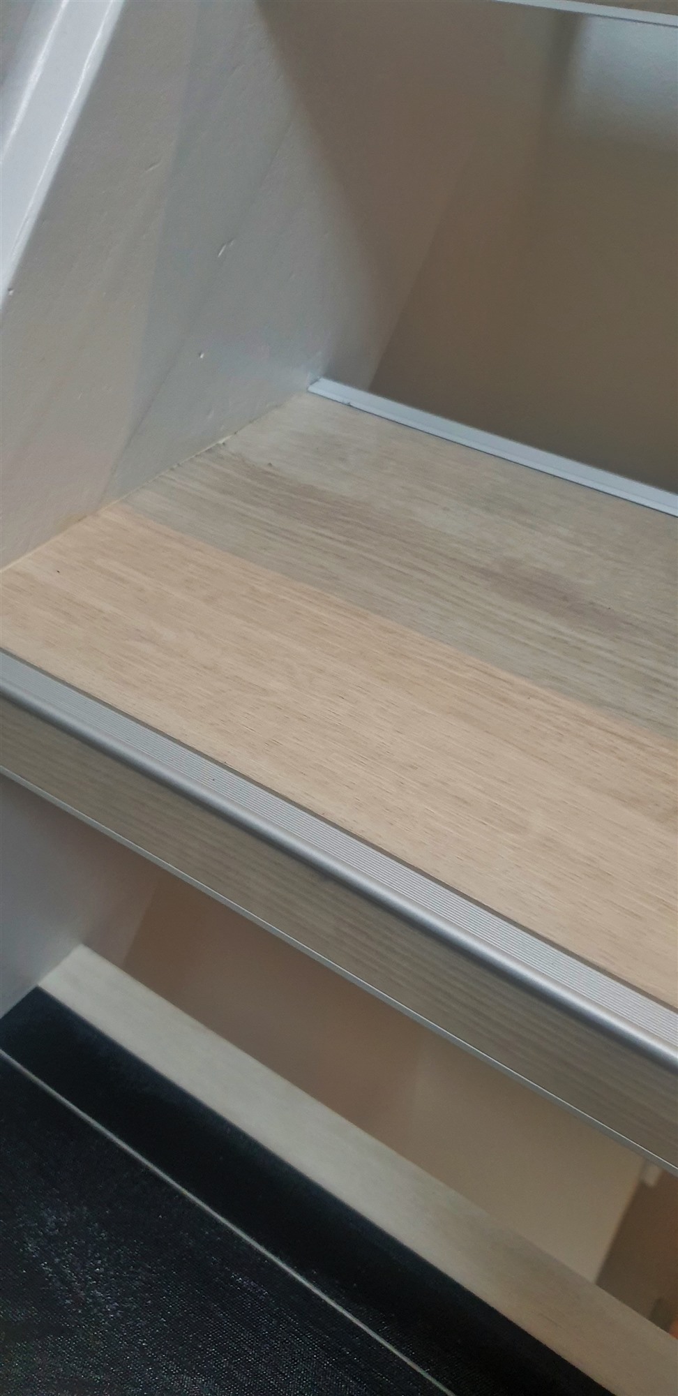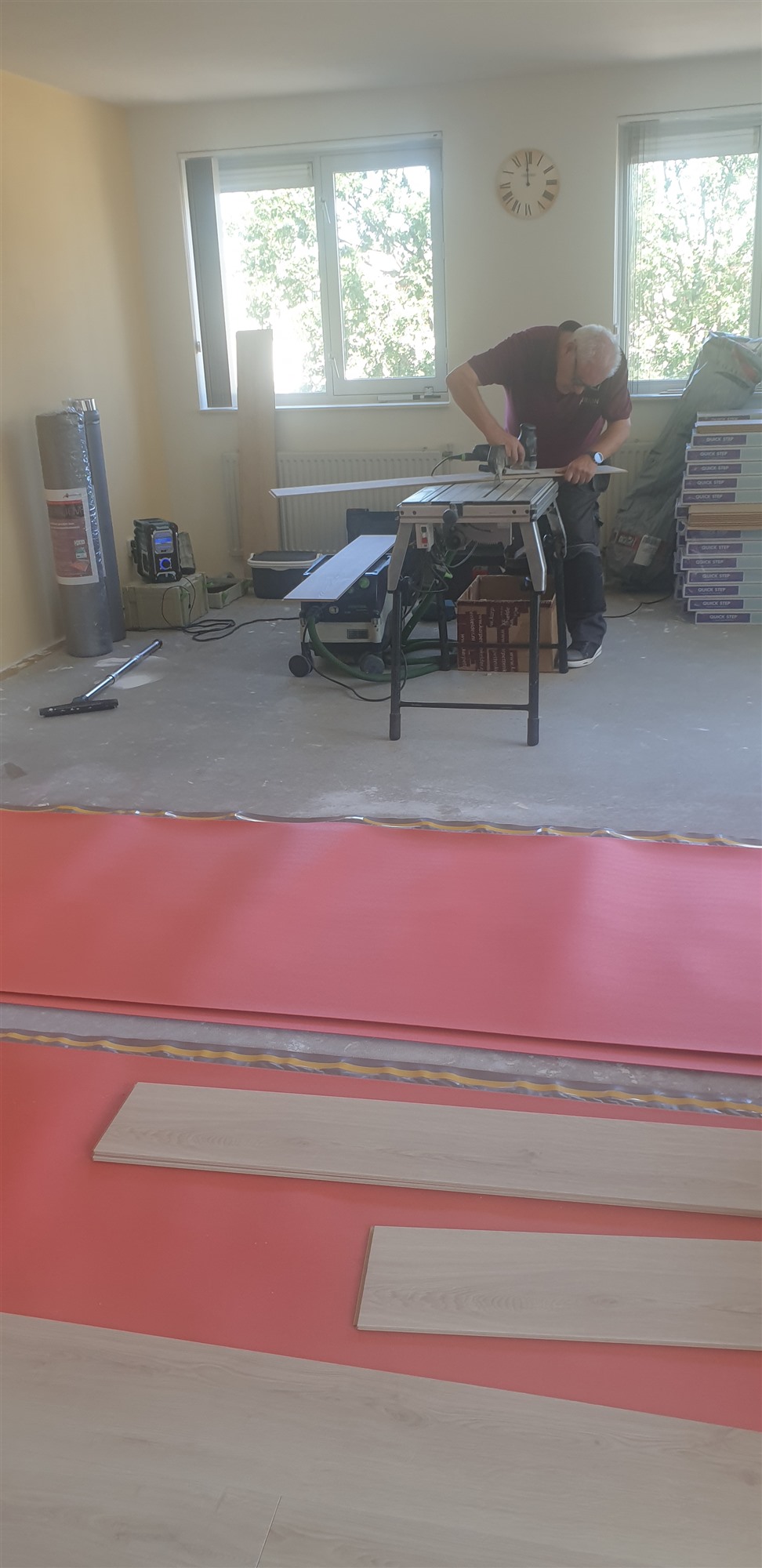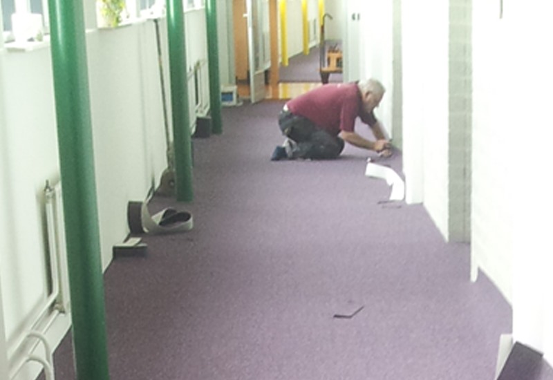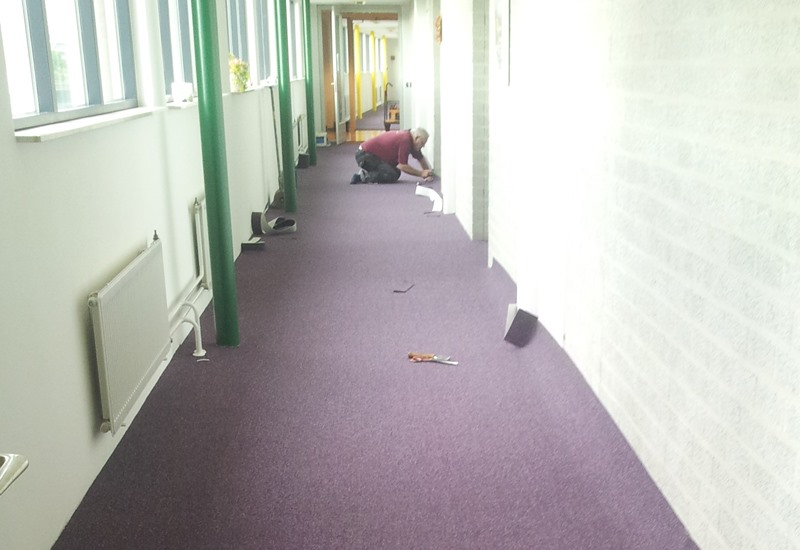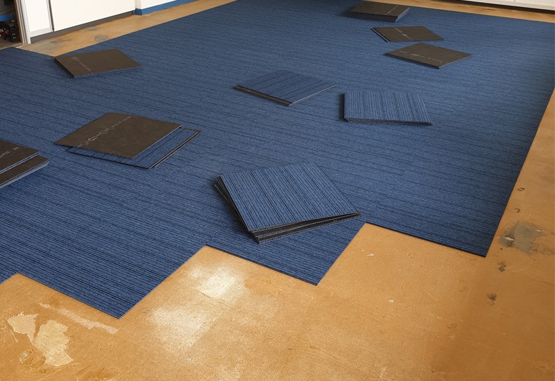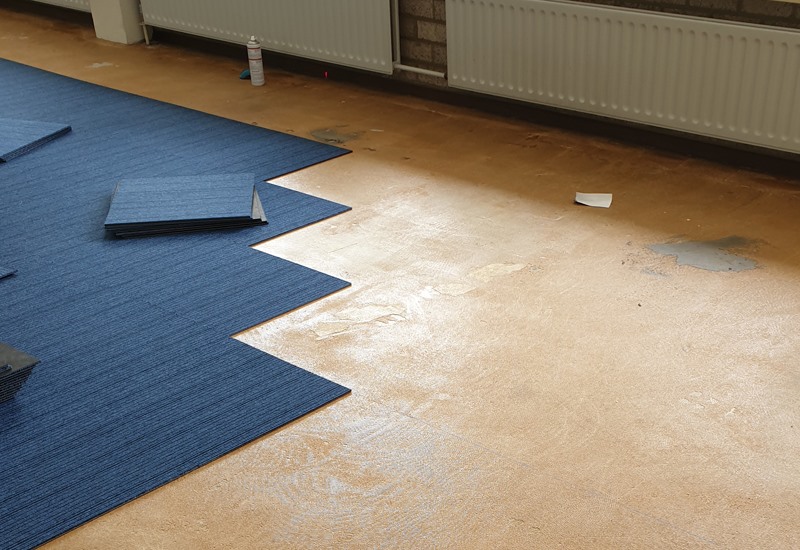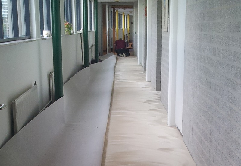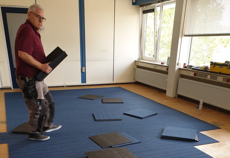 Er kon gelukkig in etappes gewerkt worden, en in goed overleg konden wij per ruimte de oude vloerbedekking verwijderen, stofzuigen, een antislip laag aanbrengen en de tapijttegels leggen.